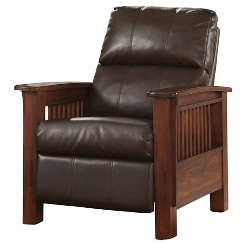 This push back recliner features mission style wood arms and a soft durahide fabric.